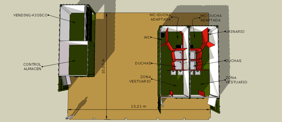 Esta línea se ha creado para implantarla en zonas deportivas que necesiten instalaciones de apoyo.Están formadas por módulos para aseos-vestuarios, bar o máquinas de vending y control-almacén.El verde ingles con el que se personaliza a los contenedores y el color natural de la madera de la pérgola fotovoltaica, nos trasmite una imagen del conjunto elegante y que sintoniza con las zonas deportivas donde se implantarán.